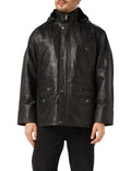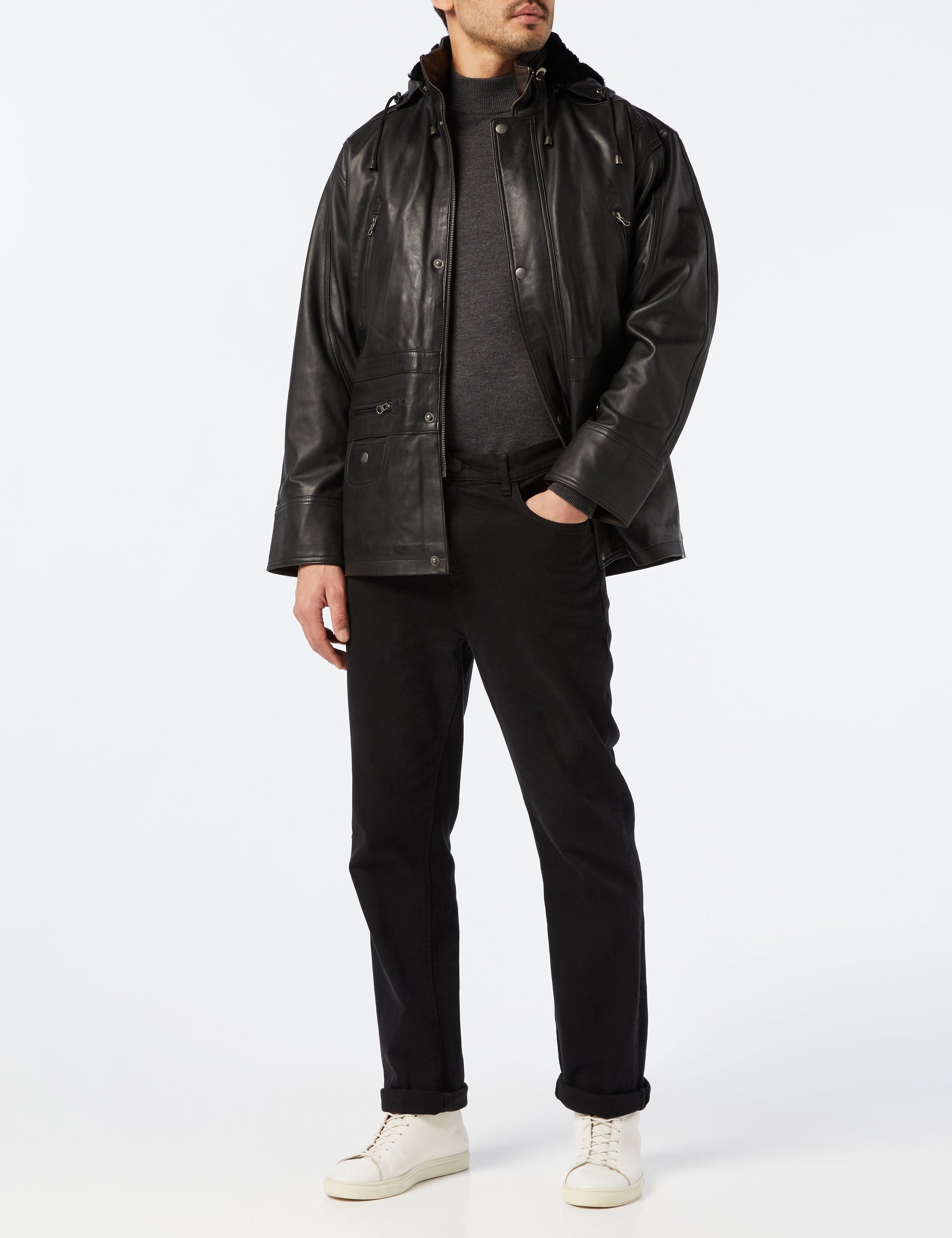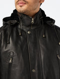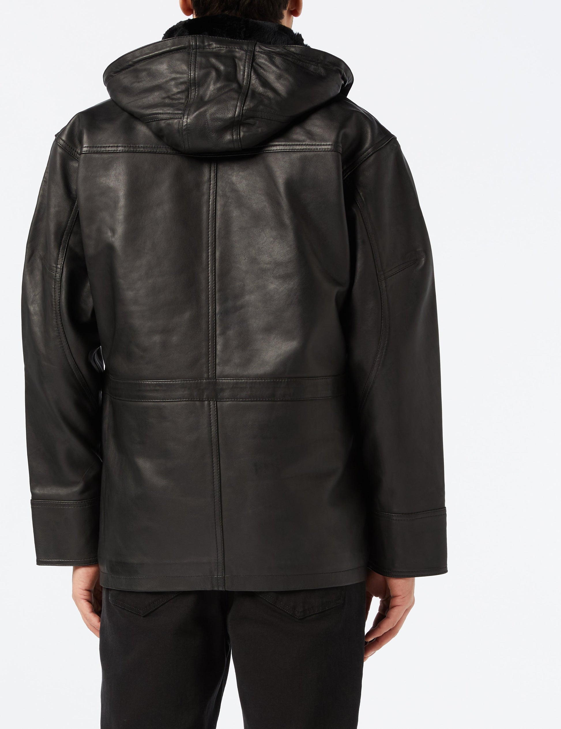 It features a leather parka design with a fur-lined, zip-detachable hood and adjustable drawstrings.