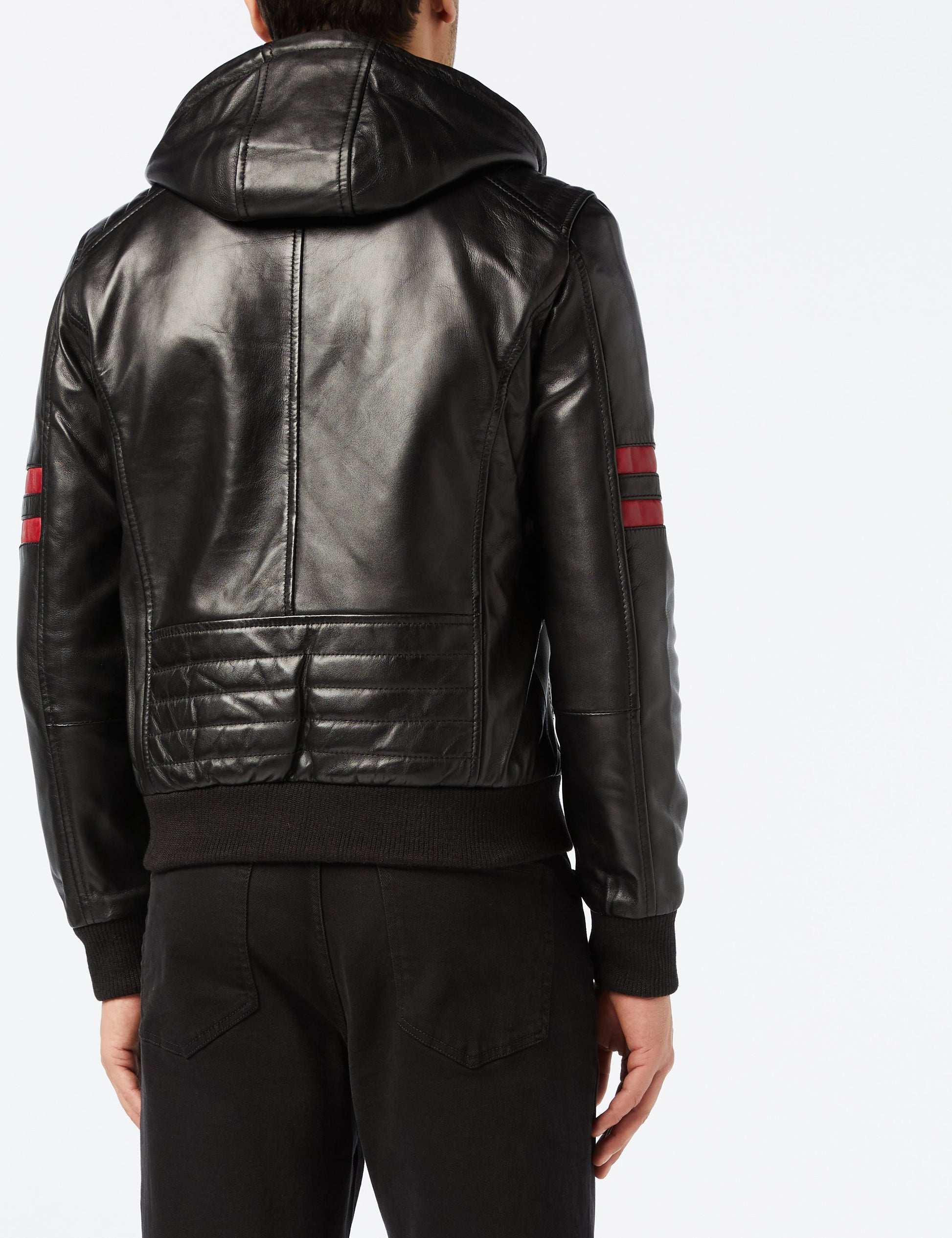 This classic leather bomber jacket comes with a fixed, fully lined hood with drawstrings.