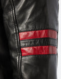 The jacket features padded ribbed shoulders with a red stripe design on the arms, ribbed cuffs, and a ribbed waistband.